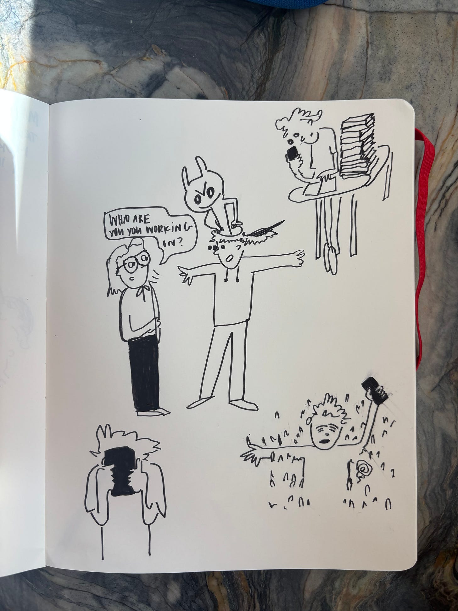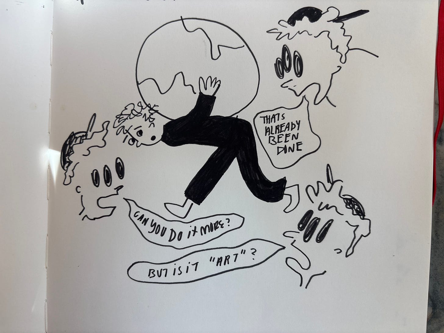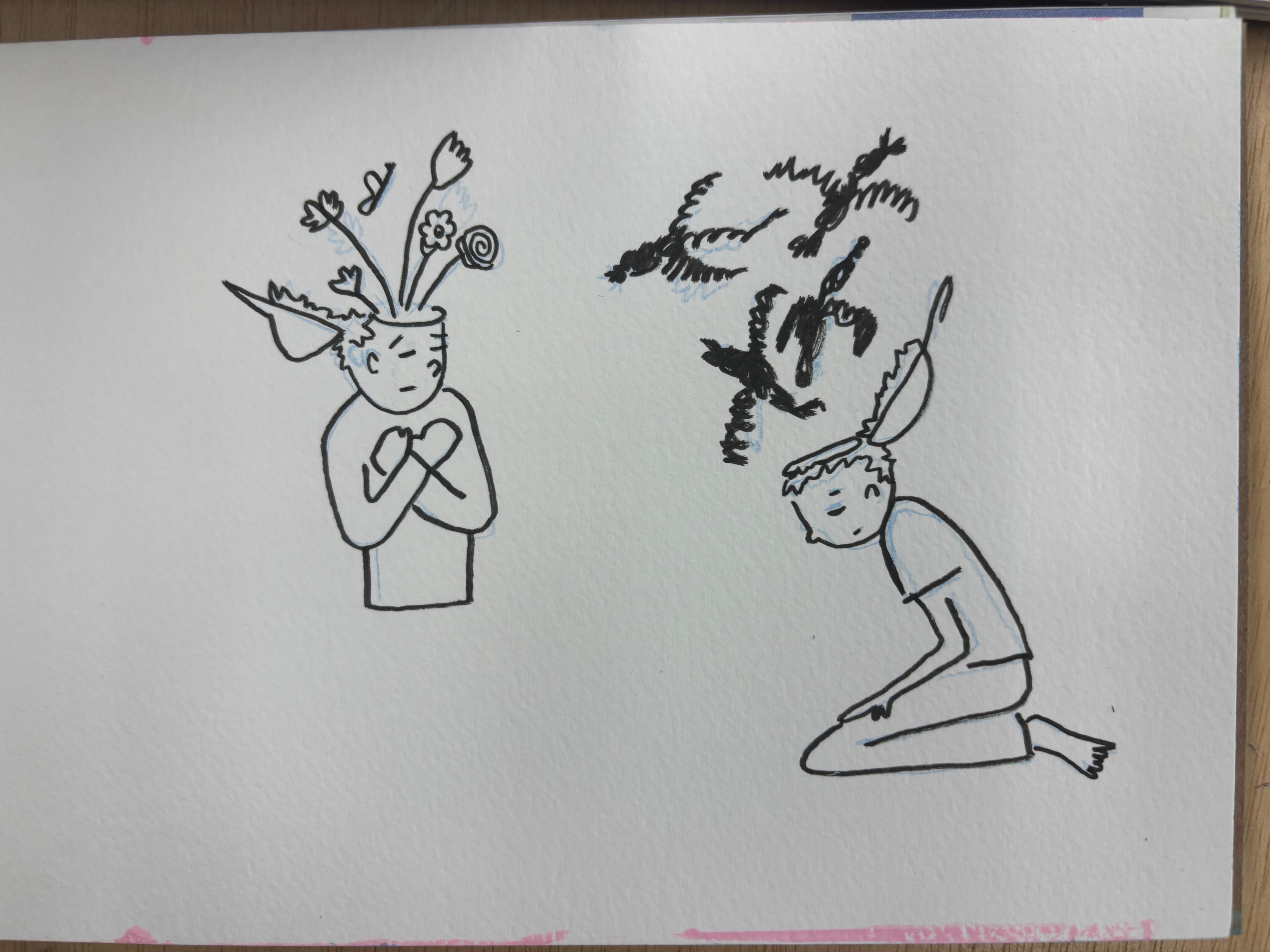 I’ve been trying to draw every day for a few months, and part of that journey has been learning to think in my sketchbook. Here’s what’s come up this week. The pressure, the little devils that live inside me, the flowers that occasionally bloom in my brain, and a rumination on the pressure I put on myself to make and create.